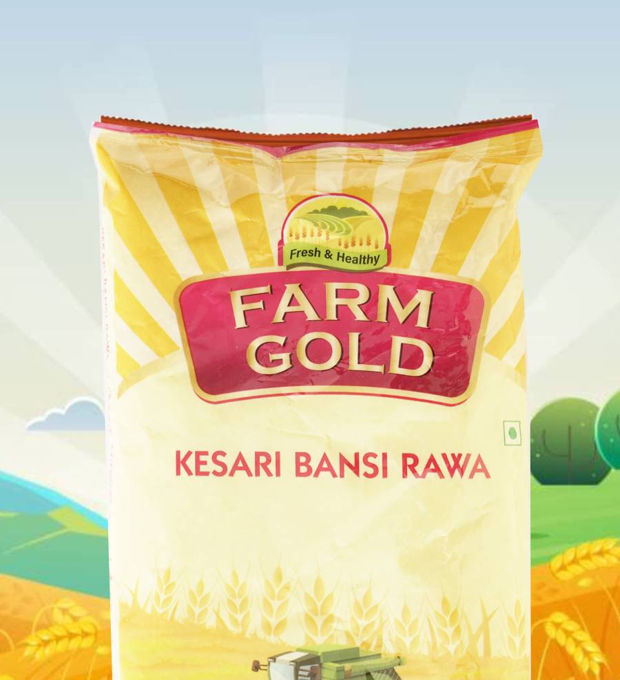 Farm Gold Kesari Bansi Rawa, a premium quality fine wheat specifically designed for making delicious kesari bhath, halwa, and other sweet dishes."